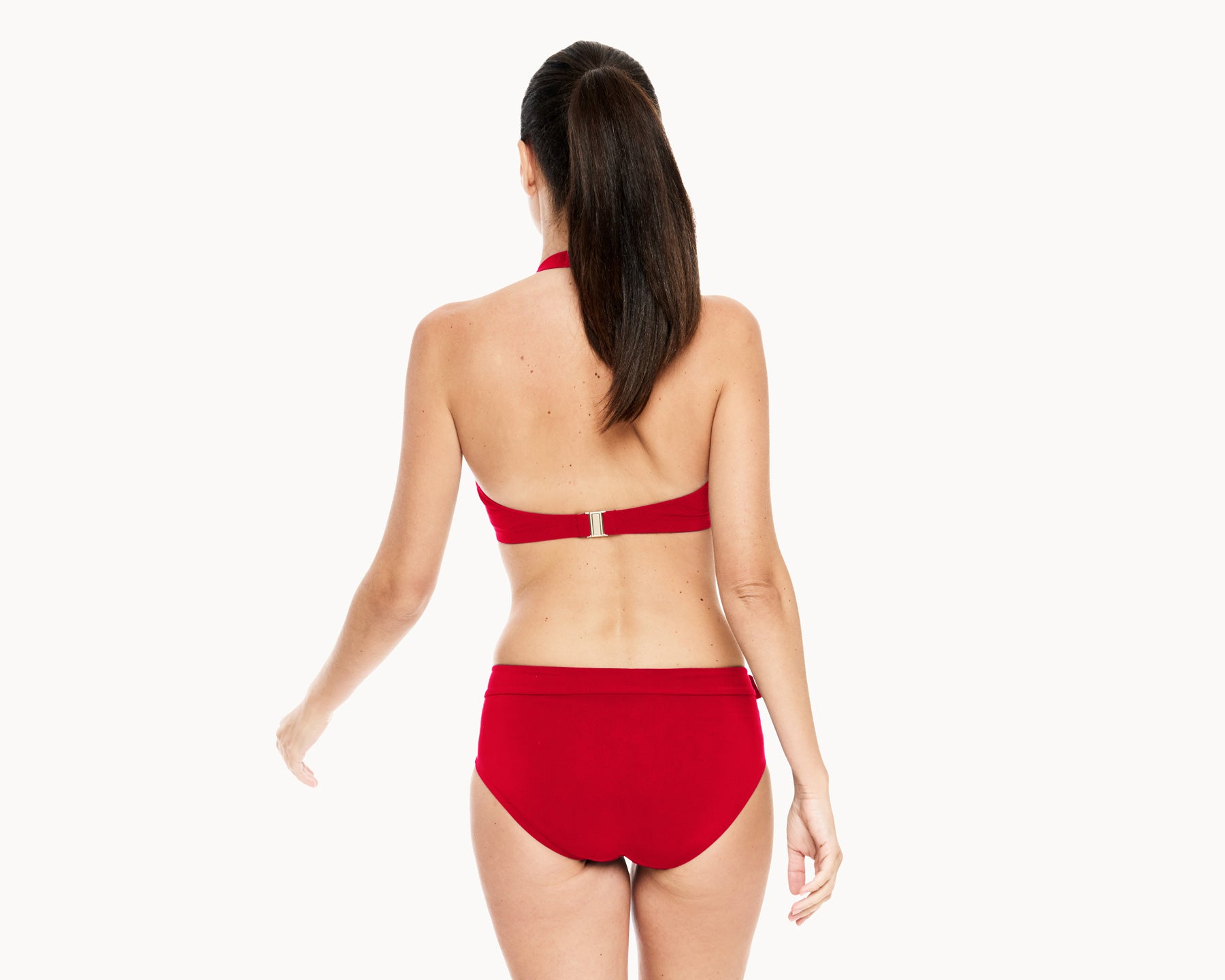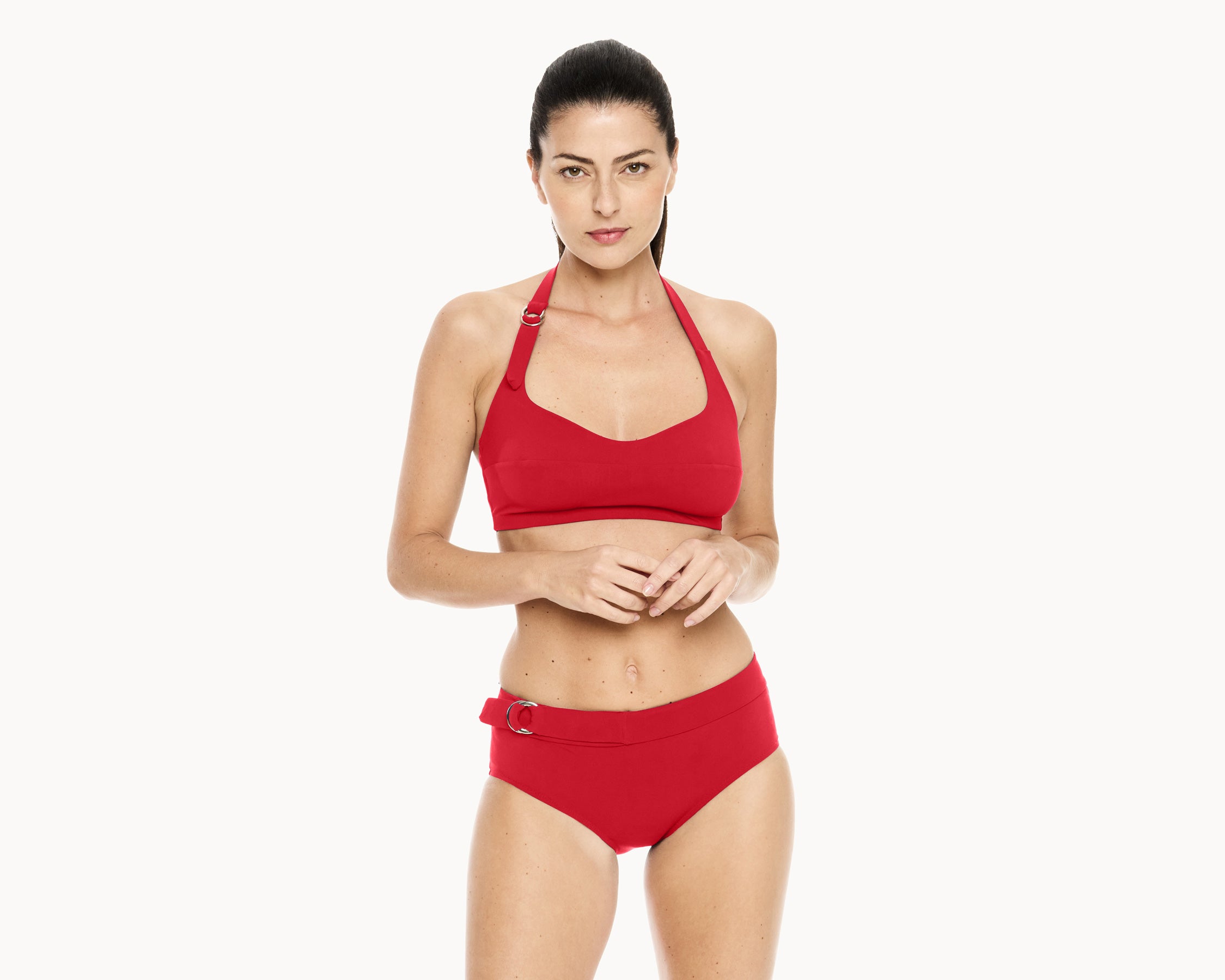 Der Neckholder-Bikini setzt mit silbernen Schnallen elegante Akzente. Der Träger ist durch den Ring individuell verstellbar, und das weiche Nackenband kommt ohne Knoten aus. Ein herzförmiger Ausschnitt und die offene Rückenpartie sorgen für feminine Raffinesse. Das formende, angenehme Material bietet hohen Komfort ohne Pads oder Bügel. Erhältlich in edlem Karminrot oder Marineblau.