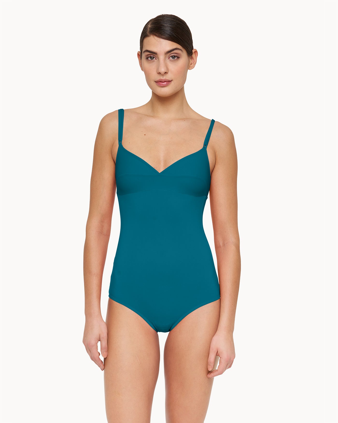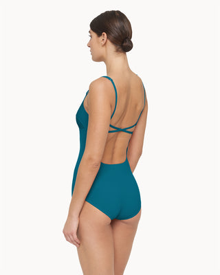 Feines Detail – Der Badeanzug mit dem tief ausgeschnittenem Rücken verleiht ein sommerlich leichtes Gefühl beim Tragen. Die verspielt gekreuzten Träger sind verstellbar, und der Halt der Brust wie auch die Weite des Umfangs kann individuell gelockert oder angezogen werden. Der V-Ausschnitt betont das Dekolleté, und die in Form geschnittenen Körbchen passen sich der Brustform optimal an.