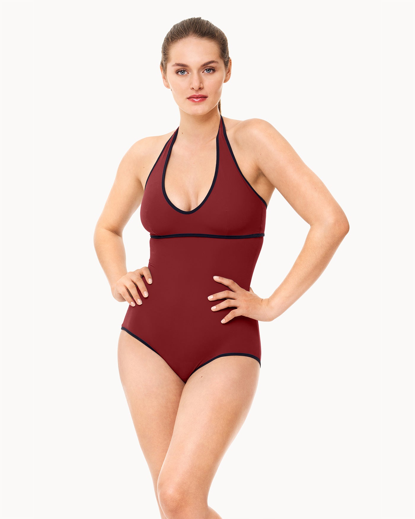Klassisch – Der Neckholder-Badeanzug ist ein echter Hingucker. Die sportliche Note mischt sich mit zeitloser, klassischer Eleganz und setzt die Figur in Szene. Die kontrastierenden Abschlüsse betonen die klare Form des Schnittes und der V-Ausschnitt bringt das Dekolleté elegant zur Geltung. Auf der Innenseite bieten Taschen die Möglichkeit um Brusteinlagen zu tragen.